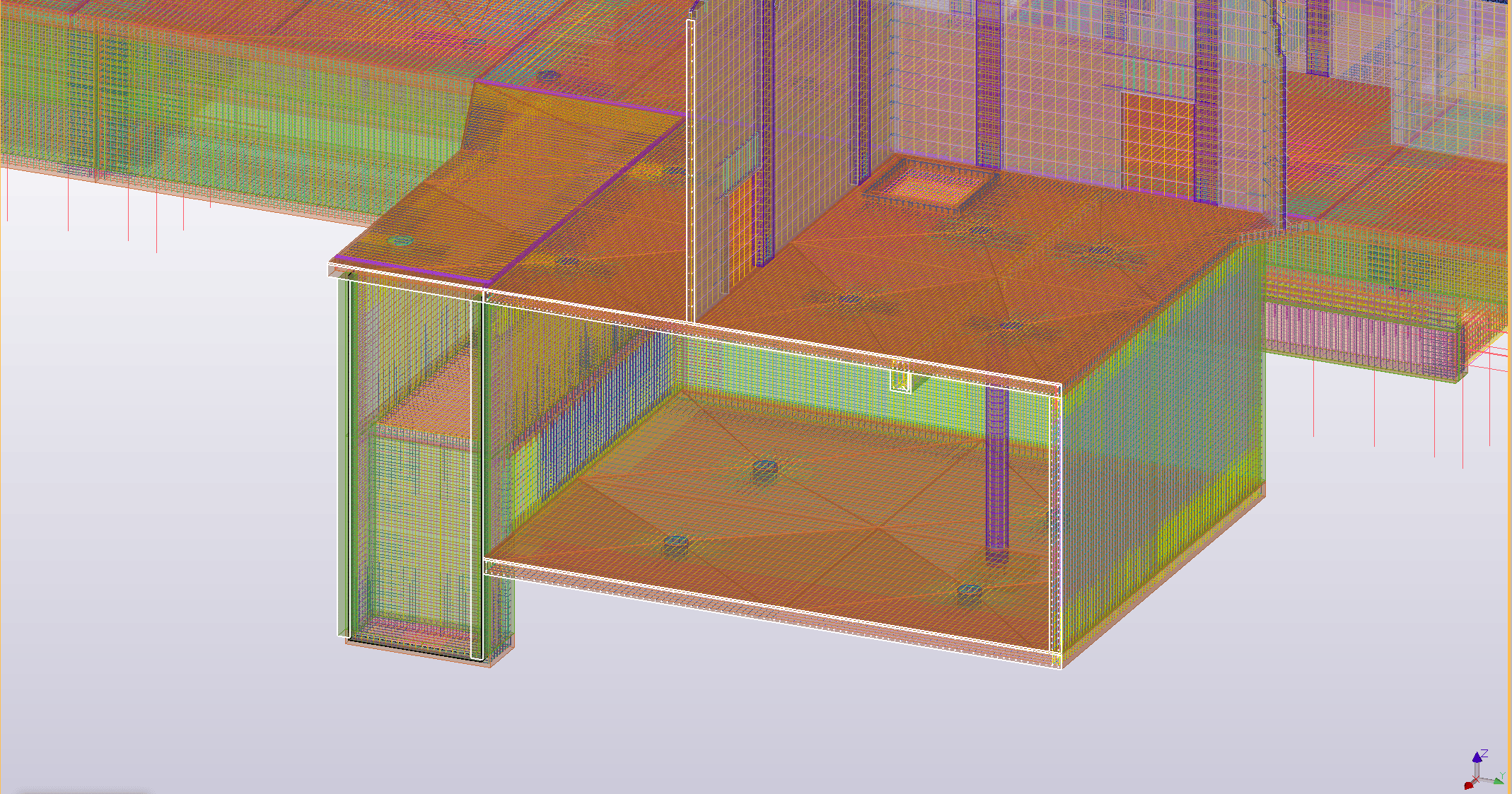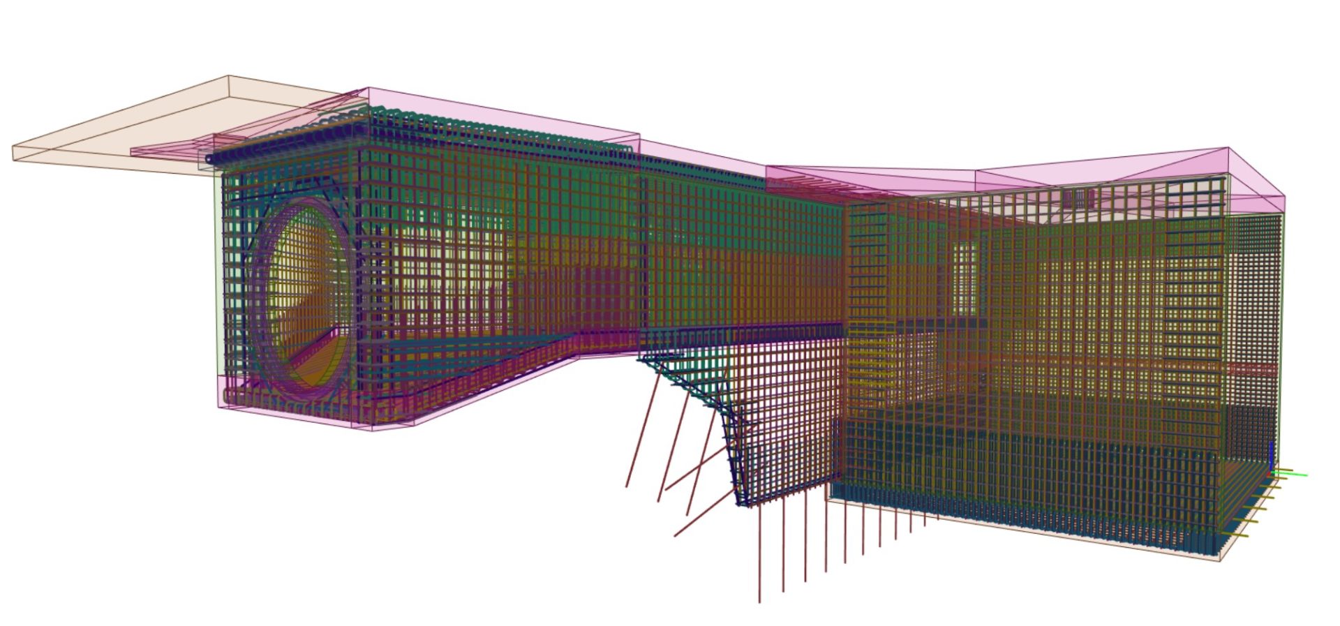 Der Auftrag war ein Teil des Projekts zum Ausbau der bestehenden Wasserkläranlage in Opfikon bei Zürich. Das Projekt umfasste zwei Gebäude. Im ersten sollten wir die Bewehrung für dessen unterirdischen Teil einschließlich der Bodenplatte entwerfen. Das zweite Gebäude dagegen hatte 3 Stockwerke mit ziemlich komplizierter Geometrie. Das gesamte Projekt wurde im Programm Allplan erstellt.