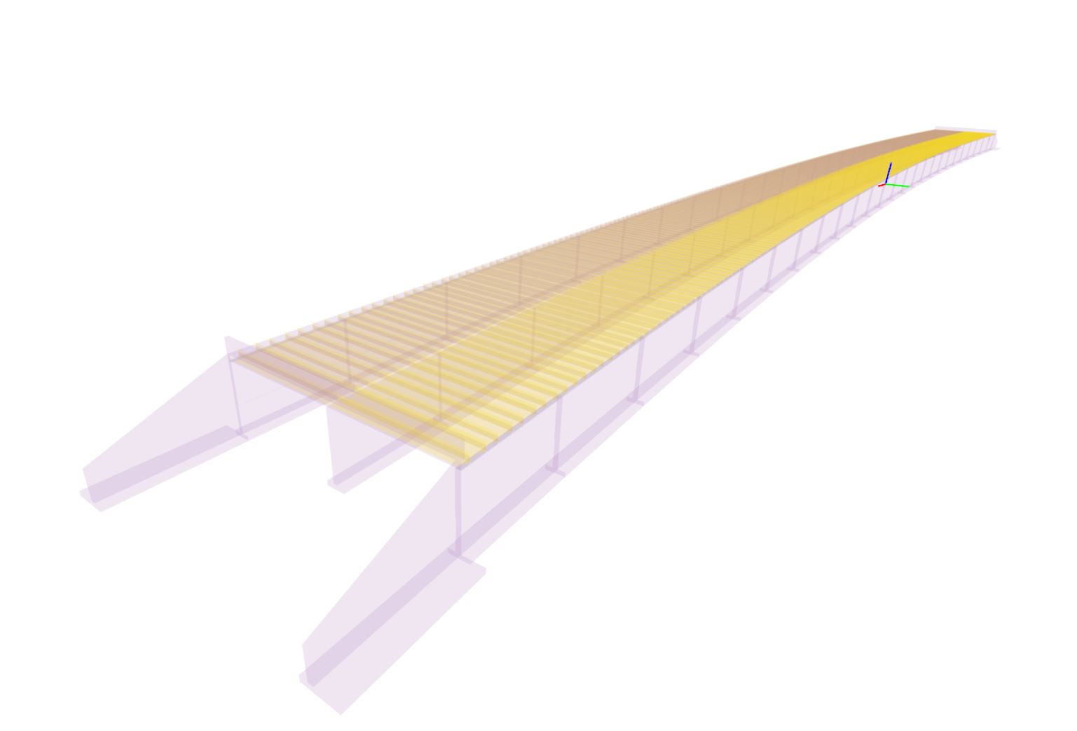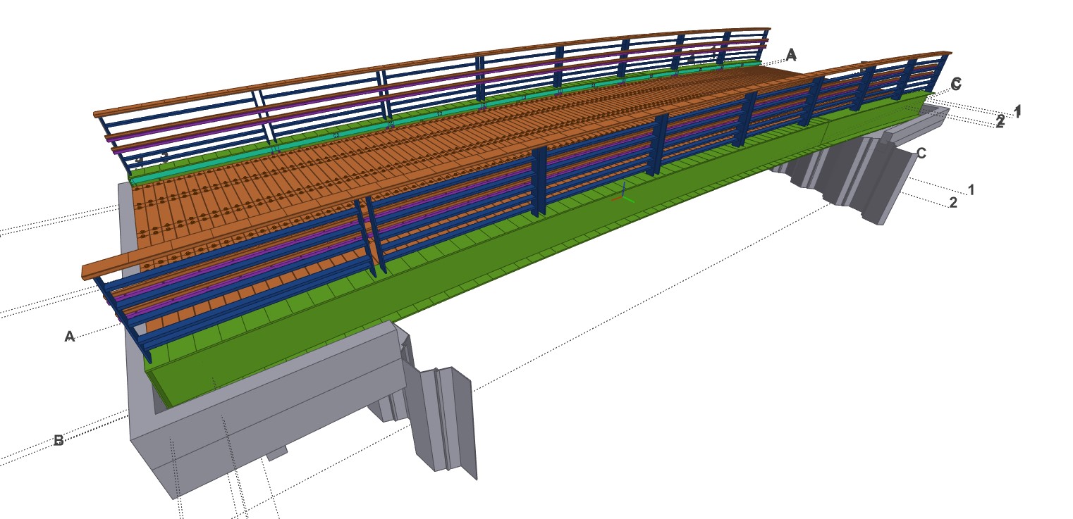 Ausführungsprojekt einer Einzeljoch-Eisenbahnbrücke mit einer Jochspannweite von 35 m, die in Deutschland entstehen sollte. Tragsystem mit integrierter Konstruktion: Stahlbetonbrücke auf Stahlträgern, gestützt auf Stahlbeton-Brückenkopfe, die ihrerseits auf Pfählen gegründet sind. Das Projekt umfasste Stützmauern. Unsere Aufgabe war es, Bewehrungszeichnungen aller Konstruktionselemente der Brücke und der Stützmauern zu erstellen.