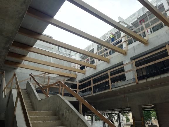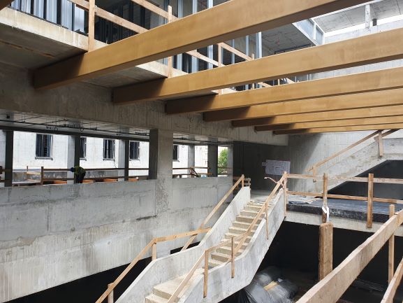 Projekt eines fünfstöckigen Bibliothek-Gebäudes mit einem Volumen von 34.000 m³. Wir waren für die Ausführung der Bewehrung und eines Gebäudemodells (Wände, Decken, Säulen, Balken) – bis auf die Fundamente - zuständig. Sowohl die Zeichnungen als auch das Modell der Stahlbeton-Konstruktion wurden im Allplan-Programm erstellt. Das Modell der Geometrie ist unter Tekla, und die Bewehrung der Stahlbetonelemente und die Ausführungszeichnungen unter Allplan entstanden.