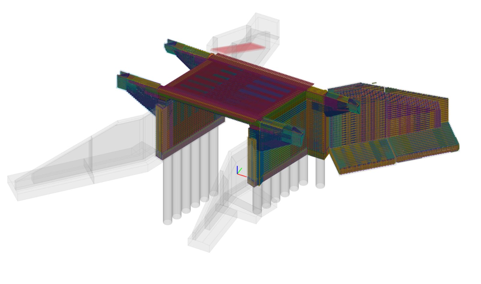 Ausführungsprojekt einer Eisenbahnbrücke in Deutschland. Das Objekt wurde als offener Stahlbetonrahmen entworfen, verbogen im Plan, mit einer theoretischen Joch-Spannweite von 9,4 m. Das Projekt umfasste auch Stützwände. Unsere Aufgabe war, Bewehrungszeichnungen für alle Konstruktionselemente der Brücke und der Stützwände zu erstellen.