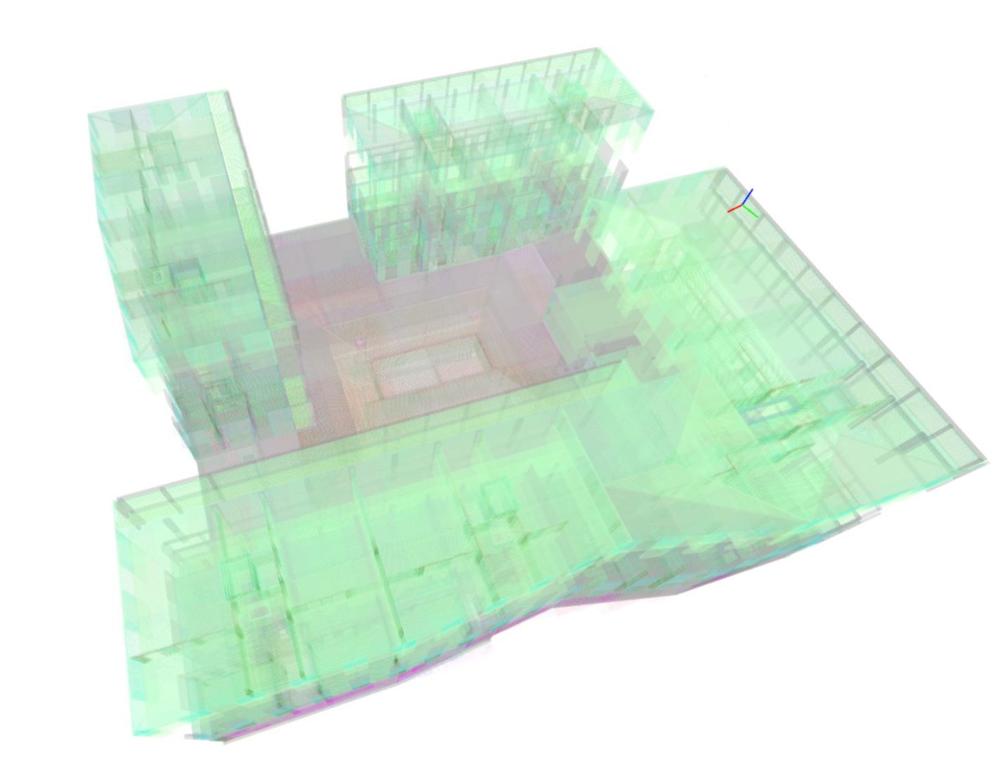 Ausführungsprojekt für ein achtstöckiges Schulgebäude mit einem Gesamtvolumen von 80.000 m³. Im Gebäude befinden sich zwei große Turnhallen mit Decken aus Spannbeton mit Spannstahlbündeln und ein geräumiges Treppenhaus mit zwei Bogenwänden in jedem Stockwerk (Maße jeweils 10 m x 4,4 m). Alle Stockwerke des Gebäudes unterscheiden sich voneinander durch ihre Geometrie und Kompliziertheitsgrad. Unsere Aufgabe war, die Bewehrung zu modellieren und Ausführungszeichnungen für alle Stahlbetonelemente zu erstellen – bis auf die Fundamente. Das Projekt wurde unter Verwendung des Allplan-Programms abgewickelt