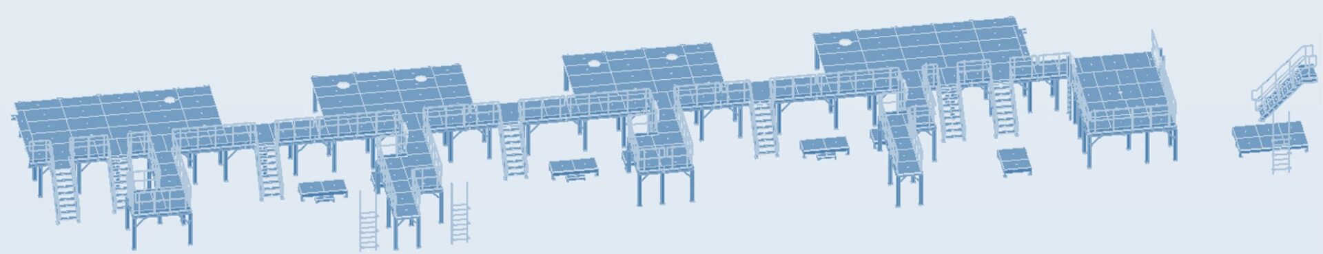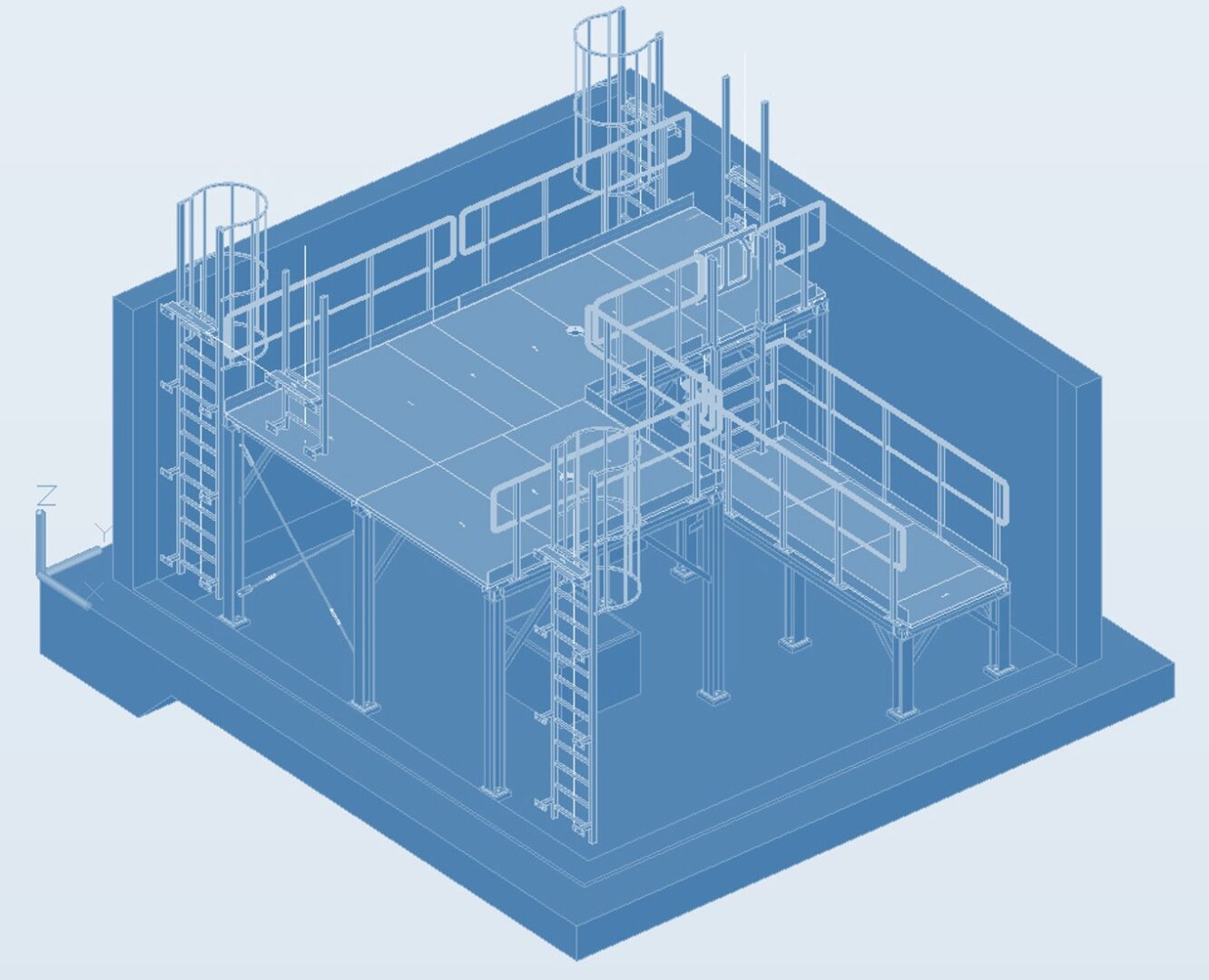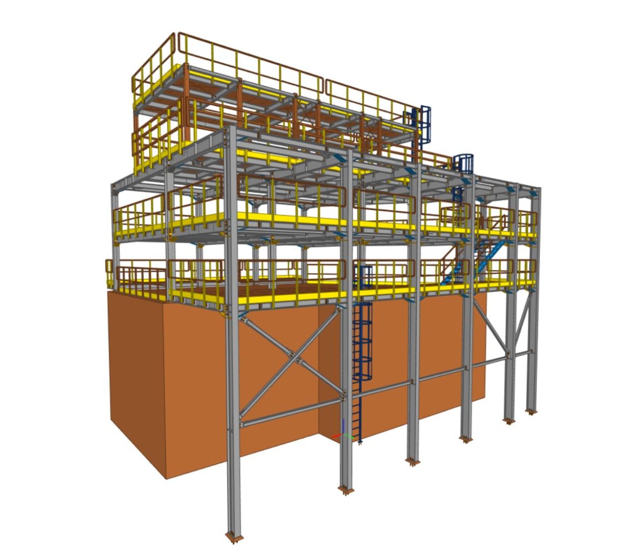Das Projekt von Stahlplattformen um Tanks herum. Die Plattformen stützen sich auf Stahlkonsolen ab, die sich auf dem oberen Ende der Tankaußenhülle befinden. Die Plattformen und die Zugangstreppen wurden in Form eines Bogens gestaltet, der an die Krümmung der Tanks angepasst ist. Die Zeichnungen wurden in der Software Advance Steel und die Berechnungen in Autodesk Robot erstellt.