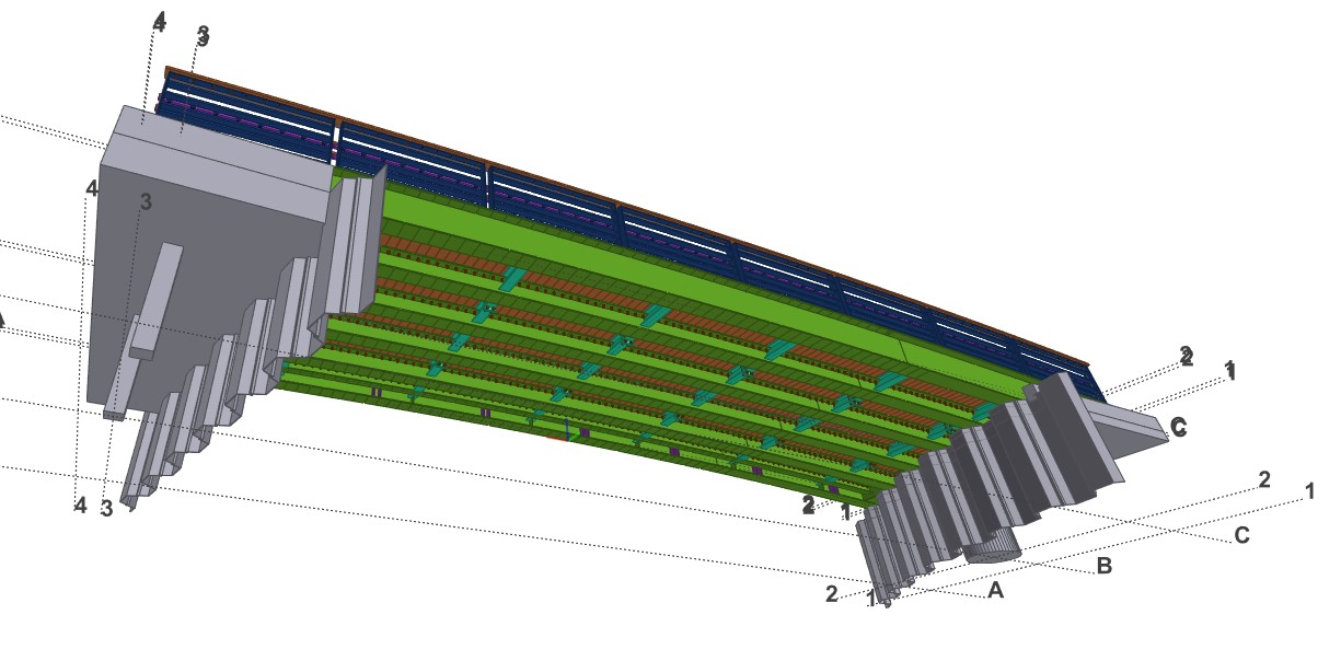 Ausführungsprojekt einer Eisenbahnbrücke in Deutschland. Das Objekt wurde als offener Stahlbetonrahmen entworfen, verbogen im Plan, mit einer theoretischen Joch-Spannweite von 11,4 m. Das Projekt umfasste auch Stützwände. Unsere Aufgabe war, die Bewehrungszeichnungen für alle Konstruktionselemente der Brücke und der Stützwände zu erstellen.
