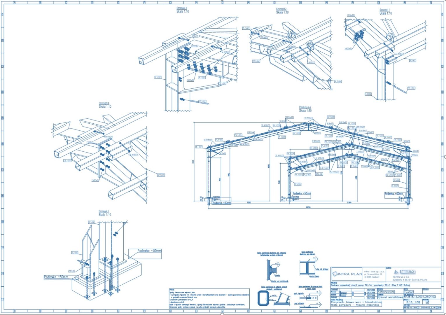 Der Projektumfang umfasst die Erstellung von Werkstattunterlagen für die Stahlkonstruktionen des Zwischenpumpwerks. Die Dokumentation umfasst den Entwurf der Industriehalle, der technologischen Plattformen und der Kommunikationswege.